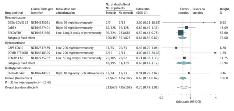 5. The WHO Rapid Evidence Appraisal for COVID-19 Therapies (REACT) Working Group. Association Between Administration of Systemic Corticosteroids and Mortality Among Critically Ill Patients With COVID-19: A Meta-analysis. JAMA. 2020;324(13):1330-41.