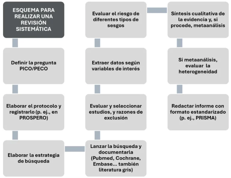 Sin embargo, realizar una revisión sistemática no está exento de desafíos, y lograr una alta calidad suele ser exigente en tiempo y esfuerzo. De hecho, la utilidad de cualquier revisión sistemática reside en la calidad de la misma, por lo que es preciso conocer en detalle todos los pasos que deben seguirse, así como cada uno de los aspectos que se abordan en cada paso (Figura 1).
