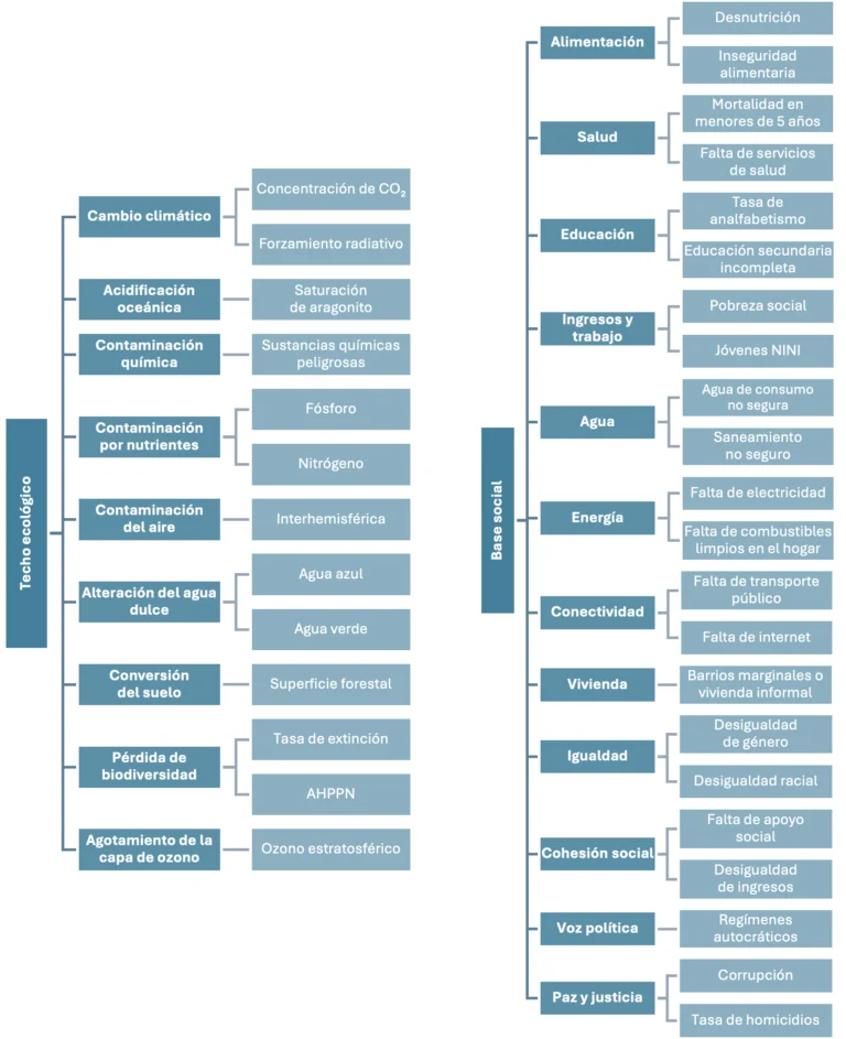 Figura 1. Dimensiones e indicadores de la base social y el techo ecológico.